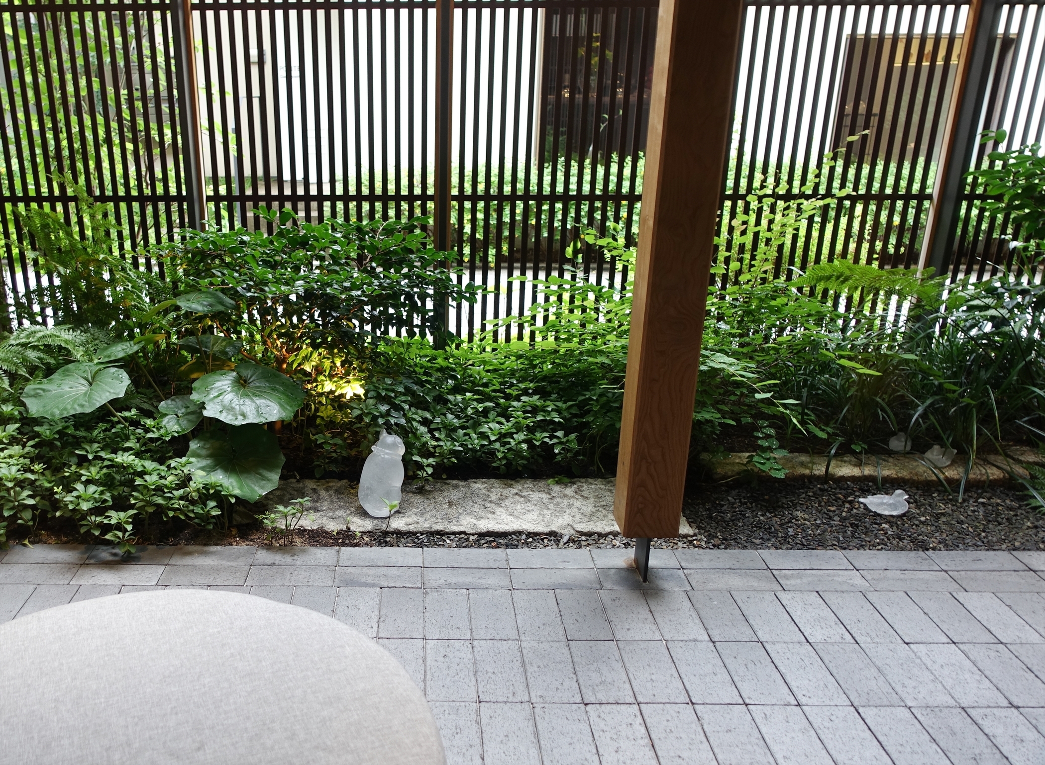 「ZENBI」1階は歩くと小さな庭のしつらえに出会う。まず入口を通ってすぐの入館受付のすぐ傍にガラス張りの小さな坪庭があり、それだけでも清涼感があるのだが、白い半透明の猫がいる。かわいい。