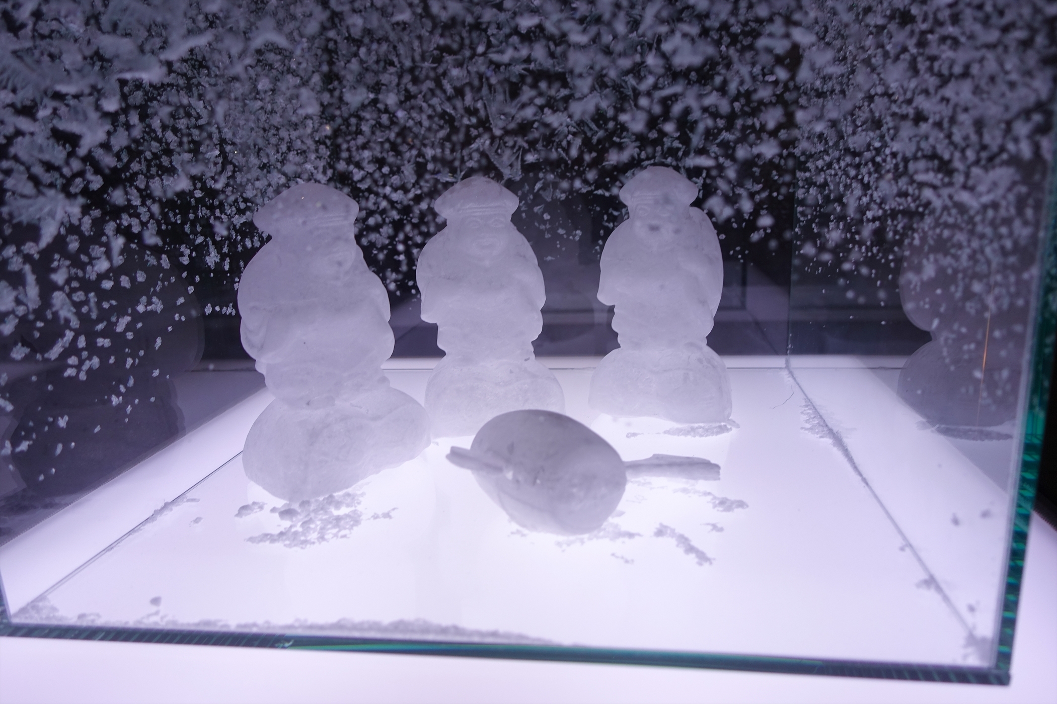 《くぼみに眠るそら ―大黒様―》と《くぼみに眠るそら ―仔犬―》である。ナフタレンの結晶の向こうにオブジェがいる。カメラのAFは結晶に阻まれ幻惑されて、主体のオブジェを直視できない。人の目からでもかなり厳しく、ケース中央の具象物こそが作品と認識されるが、コンピューターからはこのケース全体が像=作品と認識される、そのギャップが興味深い。会場で撮った記録写真の多くはピントがケースの手前にあってオブジェが見えない。