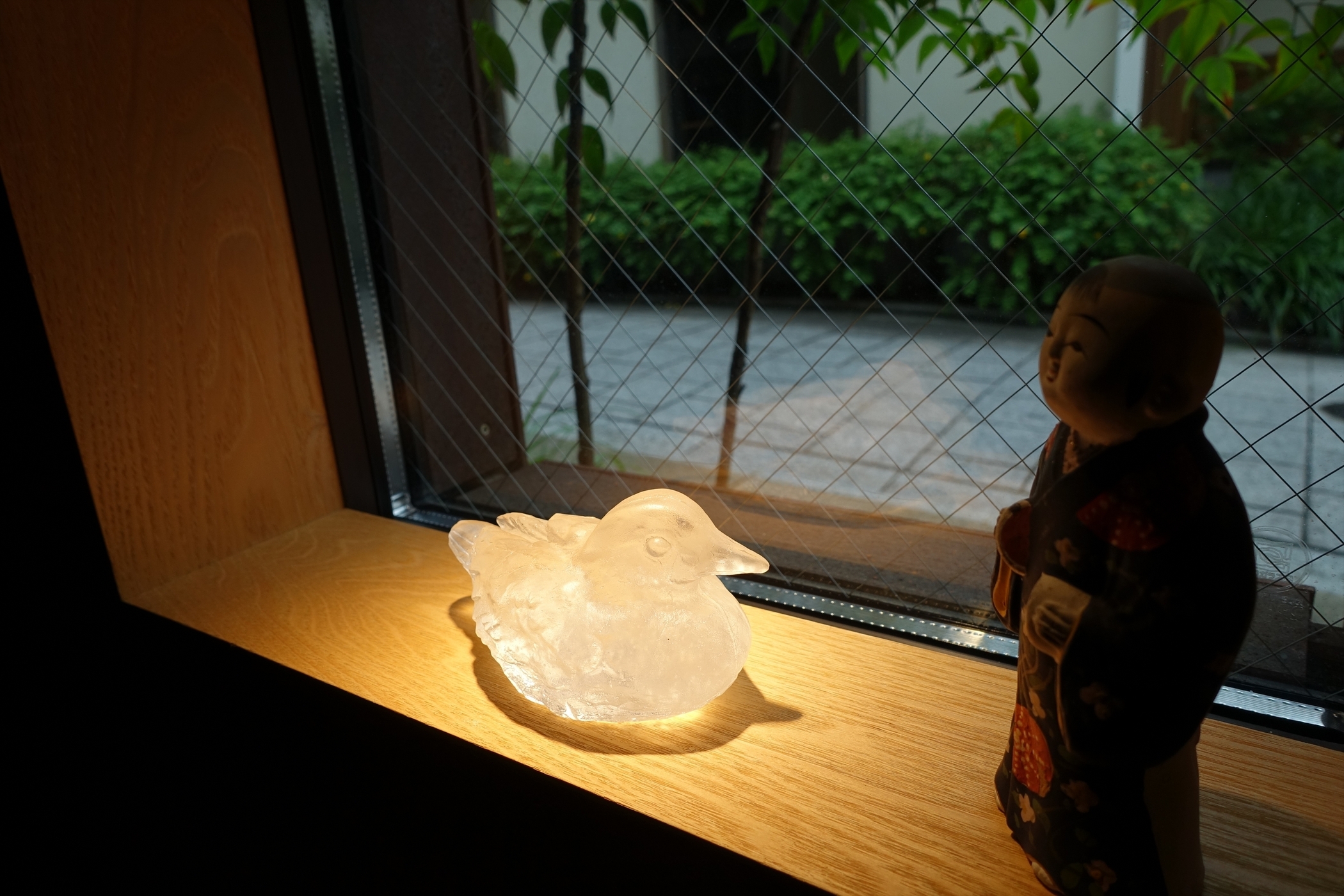 水鳥の解説の素材欄を見ると「ガラス、空気(東山窯の石膏型を使用)」とある。解説によると、宮永愛子は京焼の陶芸家、初代・宮永東山(みやながとうざん)の曾孫にあたり、彼の開いた「東山窯」に遺されていた石膏型を用いたのがこれらの作品で、およそ100年の時を超えて今ここに姿を現している。