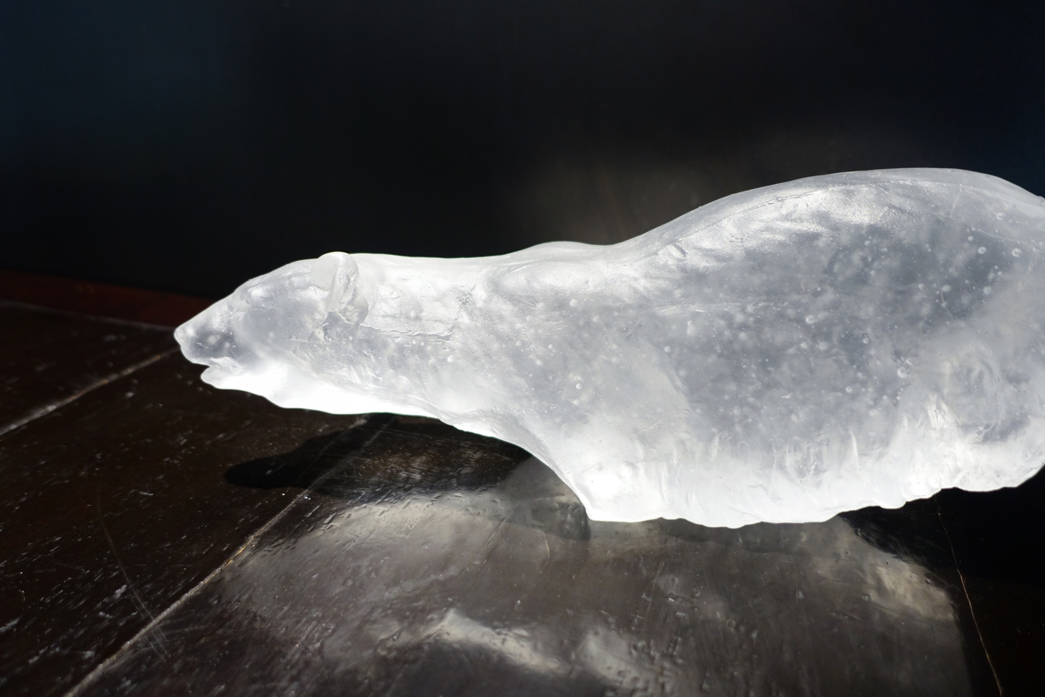 本展示で最も見惚れた作品が《くぼみに眠る海 ―熊―》、元は通常の熊なのだろうが白いガラスのためシロクマにしか見えない。足が簡略化され顔と胴体だけのため、かえって顔と首、背中にかけてのラインがリアルだ。抽象化によって生きたシロクマとなっている。なんともいえない首筋から背中のラインと膨らみがたまらない。この熊が型の「くぼみ」に眠っていたということか。では「型」とは?