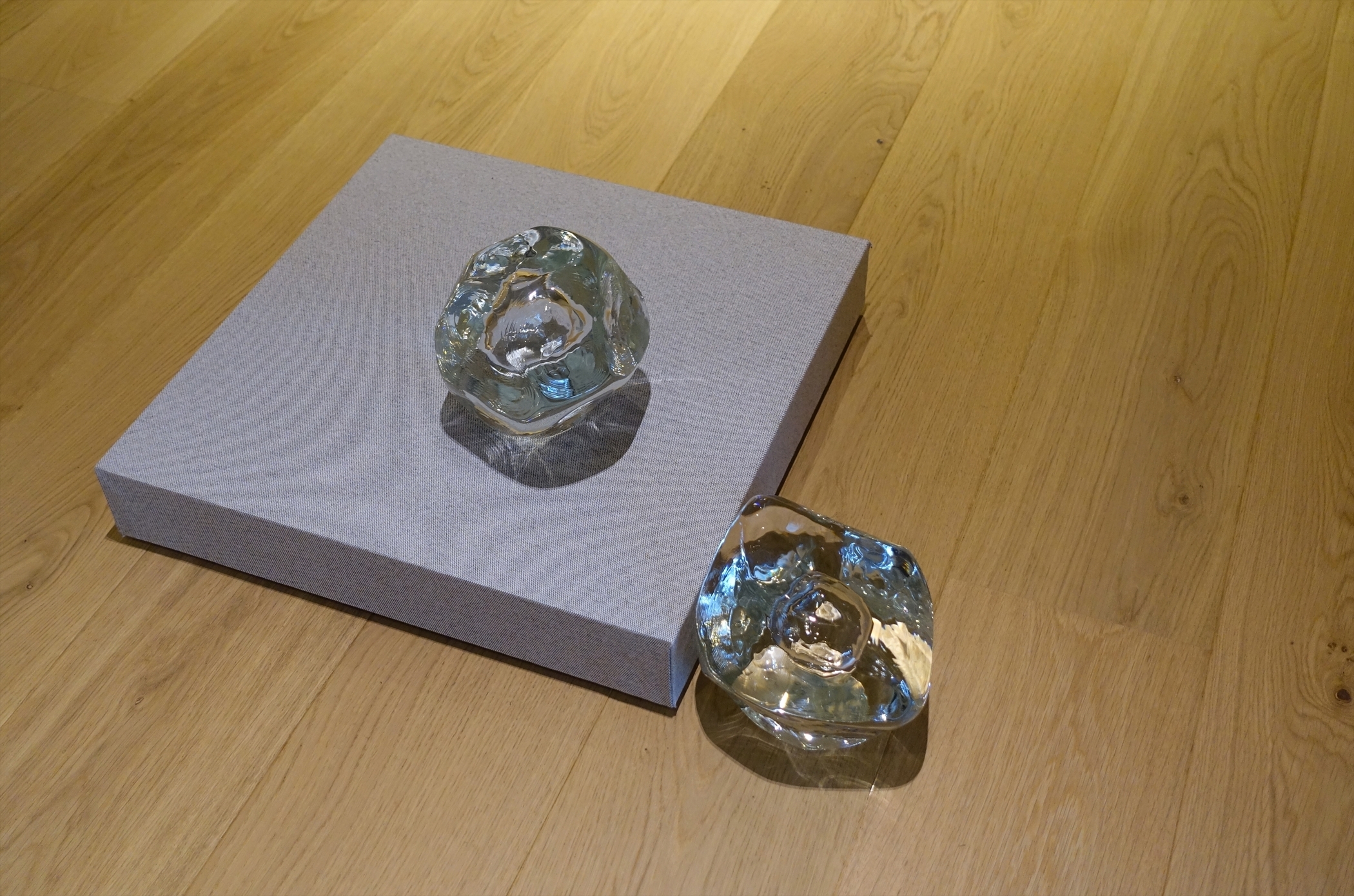 透明なガラス体になぜ音を想ったのかは分からないが、光を吸い込んで厚みの中に抱えるそれらを眺めたり覗き込んでいると、視界/光の屈曲が五感に効いてくるのかも知れない。展示ケースの内だけでなく、その外の床にも置かれているという調律と破調に感覚が影響しているのかもしれない。見ていると聴覚に似たところがざわめく。