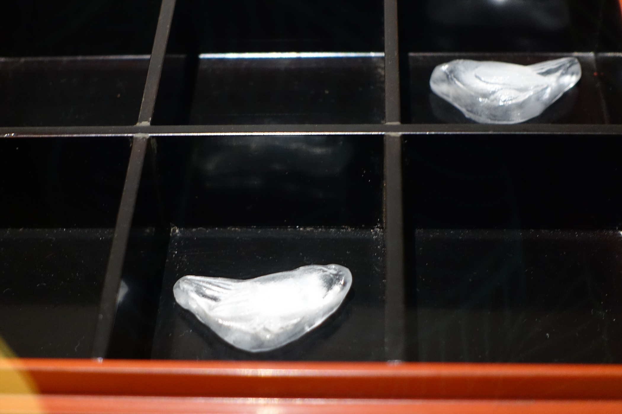 螺鈿細工の菓子重箱やくずきり用器の煌めきの見事さに目を奪われていると、ここぞとばかりに菓子のふりをして箱に入り込む宮永作品《海をよむ ―鳥のつがい―》、これも「鍵善良房」の菓子木型から起こされたガラスであり、時の流れを超えたものだ。かわいい。菓子とは何か、型とは何か、創作においてはどちらが実体/本体であるか。型さえあれば「実」は幾らでも「複製」できる。型は唯一であり実=菓子は不特定多数である。だが菓子と違って本作では型から生まれたこの物体こそが唯一性ある「作品」本体なのだ。こうした問いを重ねていくことで小腹が減り、甘いものが欲しくなるのである。