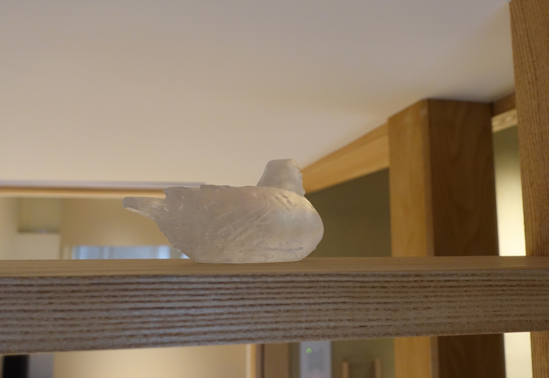 2階の2つの展示室ではかわいい動物キャラクターから様相が少し変わる。抽象度の高いガラス作品《ひかりのことづけ》が多数置かれ、時間の流れの硬化、記憶と音を封じ込めた場という印象が強まる。