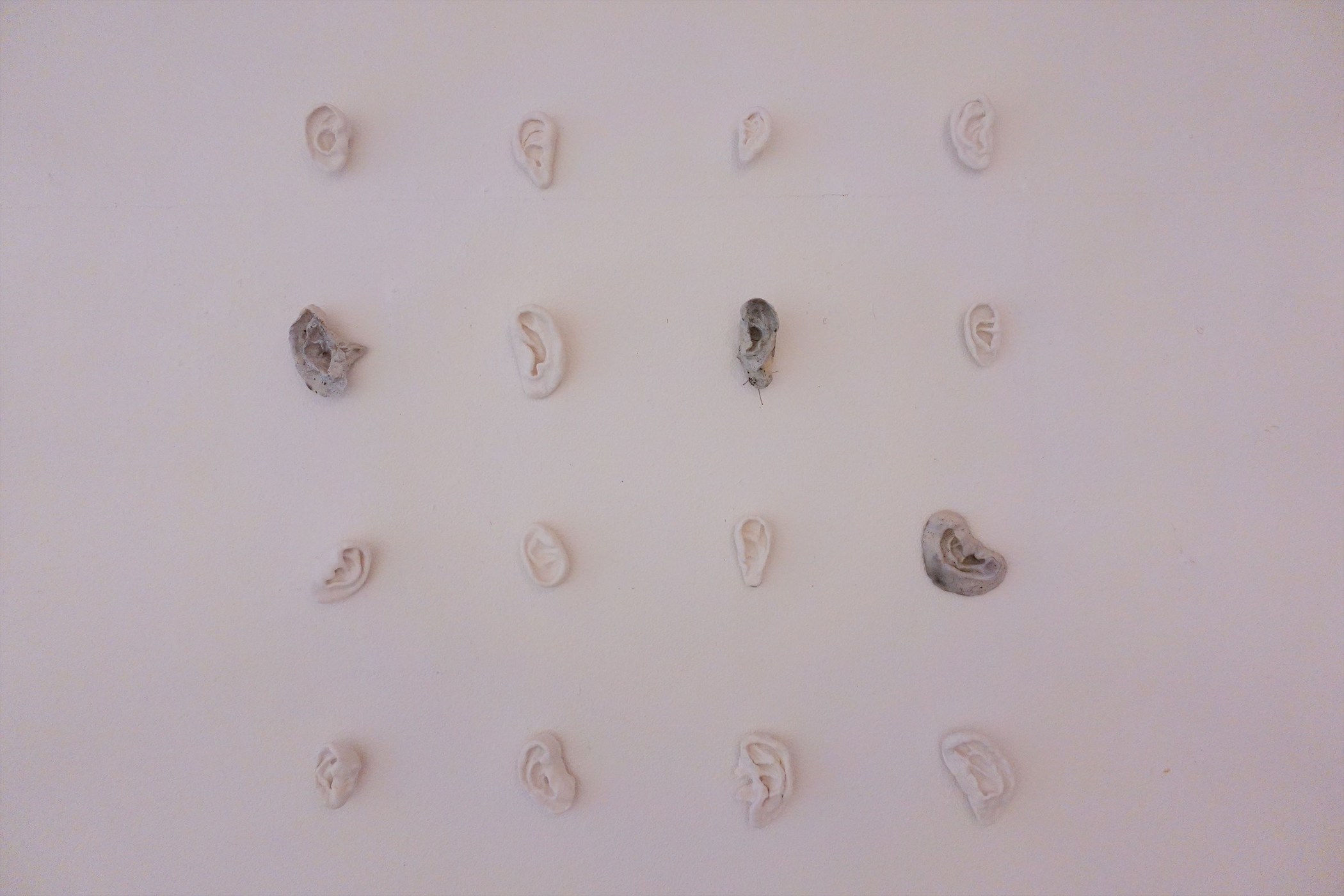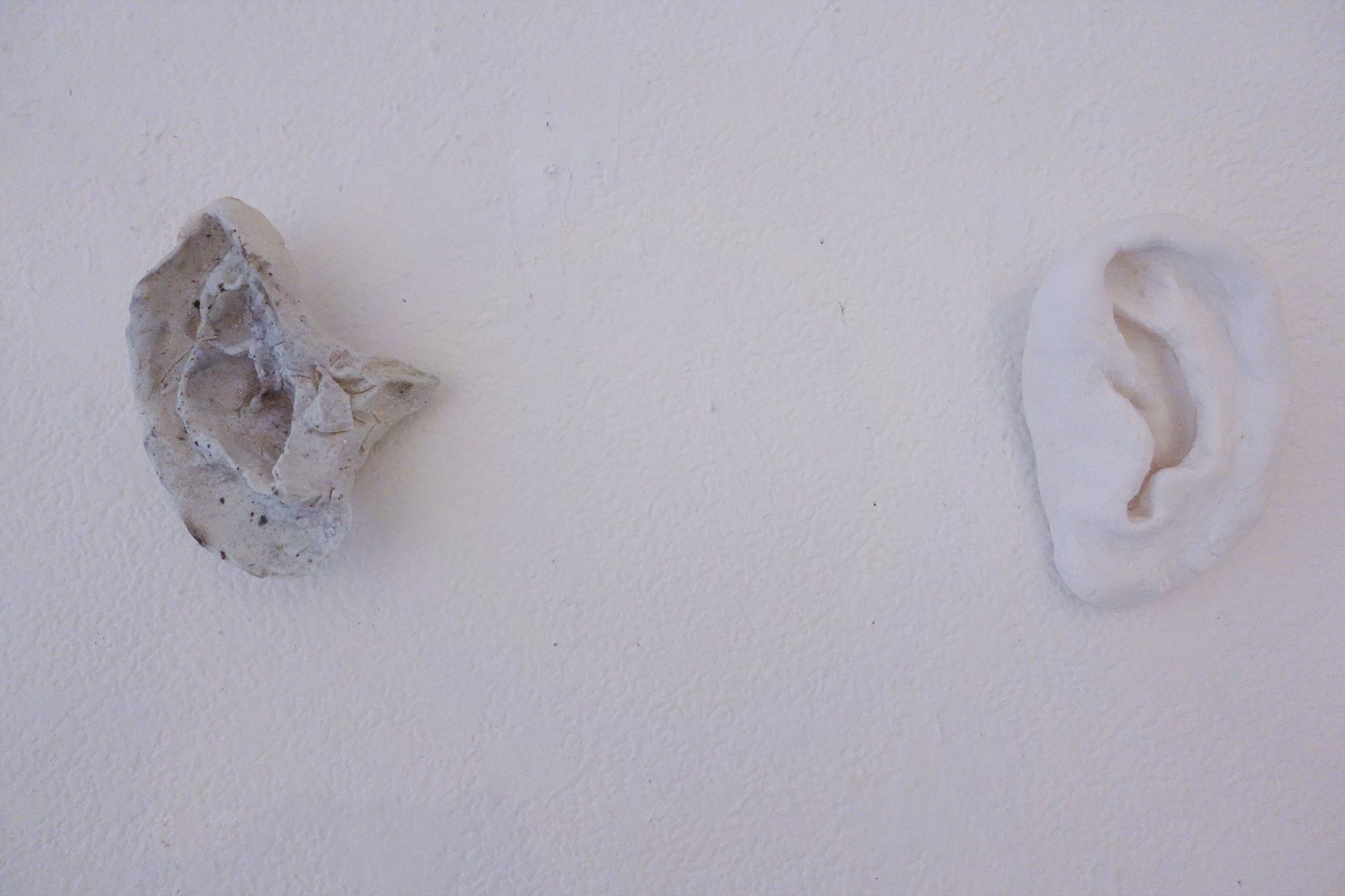 最も写真離れしているのは耳の陶彫《夢の耳》で、写真ではない。ワークショップ参加者が自分の耳の形の陶彫を作ったという作品だ。なので展示品を見ているだけでは写真の要素は全く見当たらない。耳だ。だが制作工程がユニークで、「土はその身に起きたことを記憶している」という着想と「夢の中で写真は撮れない(撮ってもこちらへ持ち出せない)」もどかしさとを結び付けており、土に夢の内容を語り聞かせて記憶させ、後は黙って自分の「耳」を作る、つまり土が音のフィルムのように記録媒体となり、紙プリントのように可変的に立体で加工されるという、まさに写真的な記録・転写と拡張のプロセスを経て作られている。