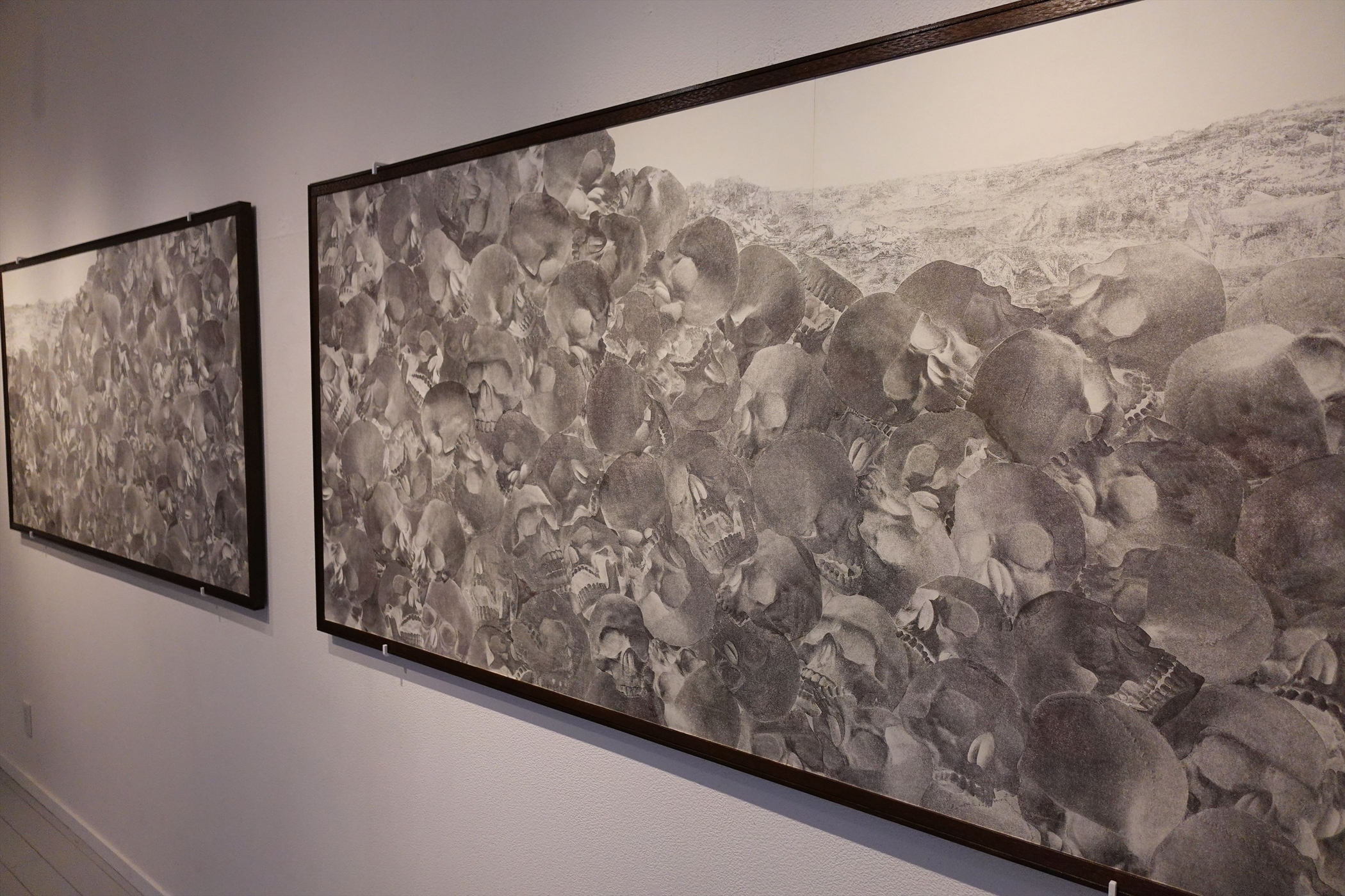 まず部屋に入って目に飛び込むのは大きな2枚の日本画のような、鈴木崇《Trophies of Rightousness(正しさの戦利品)》は、浅いモノクロで描写された地形の襞のような陰影は、近づいて見てみると全てドクロの図なのだった。大量に果てしなく積みあがるドクロの虚無的な、国なき風景。