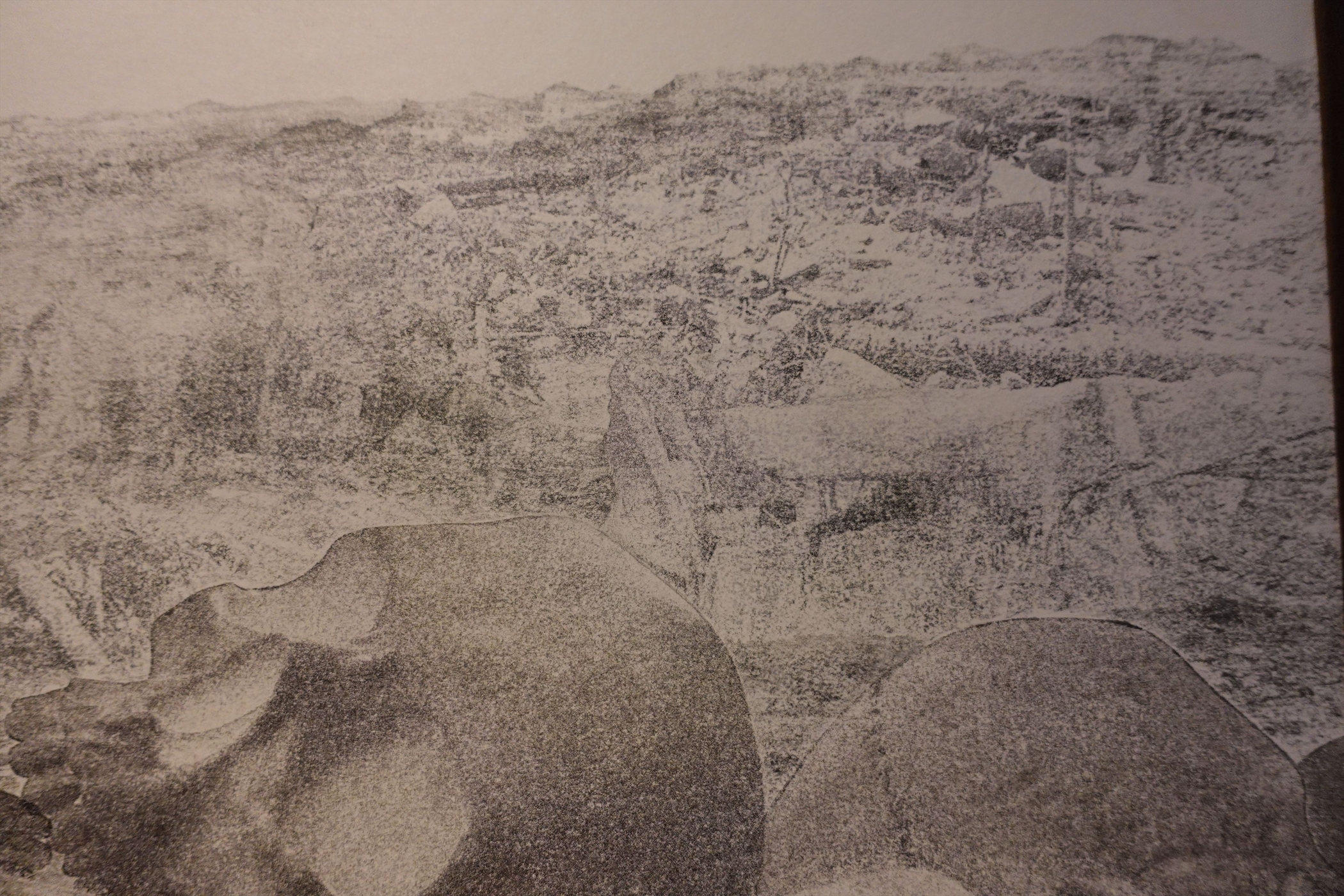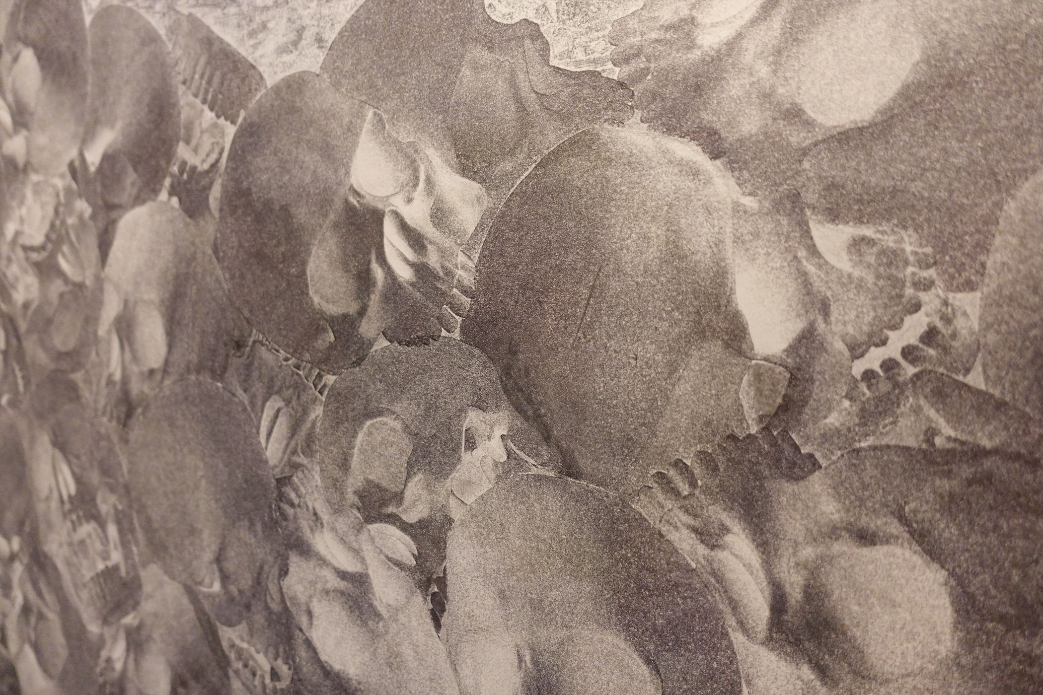 まるで高度な技量でリアル線描画かと見まがうが、大量に重ねられたドクロの図は「コピー転写」、レーザーコピーで出力した写真イメージをラシャ紙に転写していると、後に作家ご本人に教えていただいた。