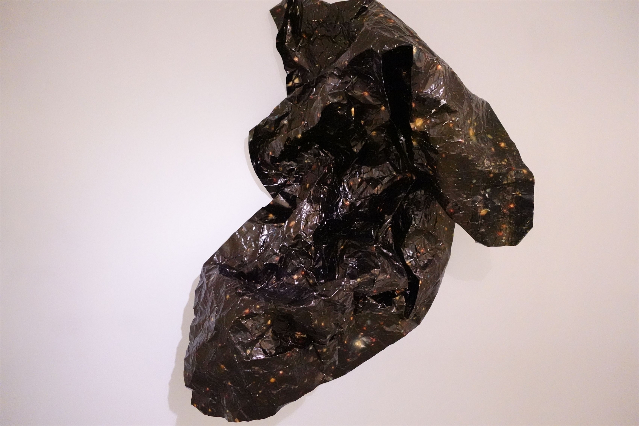 写真の余白が焼き抜かれて顔(目)が浮かび上がる作品《Family Ritual(Phantom Mother-in-law)》は、作者のパートナーの母親の若い頃の顔写真で、早逝したためリアルに会うことはなかったが、古き写真(への関与としての創作行為)を介して関係性を結ぶ。茶碗《青い霊》では作者と陶芸家(福本爪紅)の顔が入れ替えられて架空の人物となっている。大きな黒い紙を折り曲げた立体物《歌う船》はアン・マキャフリーのSF小説のタイトルを引用したもので、星空の写真を立体化しており、私達は宇宙を平面的にしかイメージできないが、それは立体の空間なのでは?と問いかける。