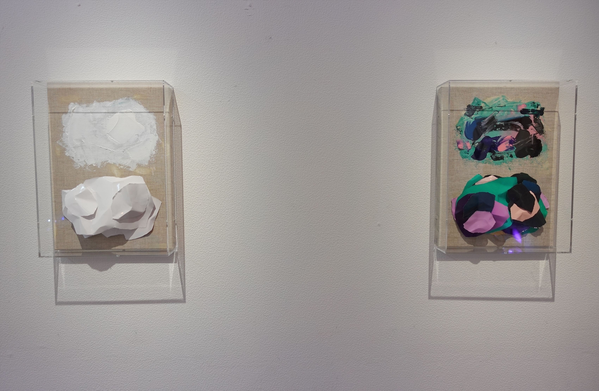 これらは「色」、ひいては「光」が姿形を宿されてこちらへ現れたものということになるだろうか。ペインティングは塗料を直接に支持体の上へ塗り付け光の反射と吸収を催し、プリントは光の様々な波長が感光した紙を千切って重ねることでこちらも反射と吸収を行う。絵画と写真がそれぞれに表出するエッセンスを、フレームを砕いて抽出したエキスがこの組み合わせだとすれば、アクリルによる封入と規則正しい展示の型を通じて眼に取り込む鑑賞行為は、絵画と写真に分岐されてしまった「光」を網膜で最初の「一つ」へ混ぜ合わせ還元する。