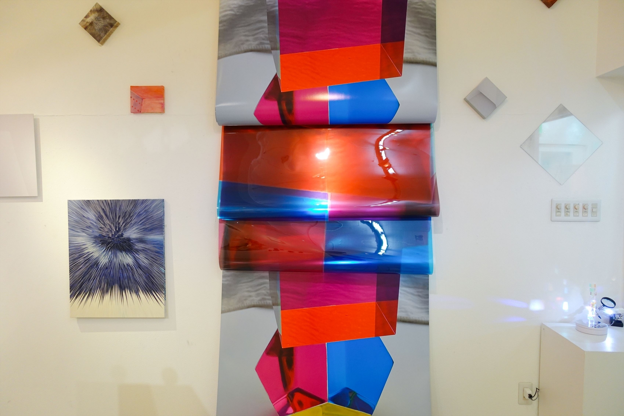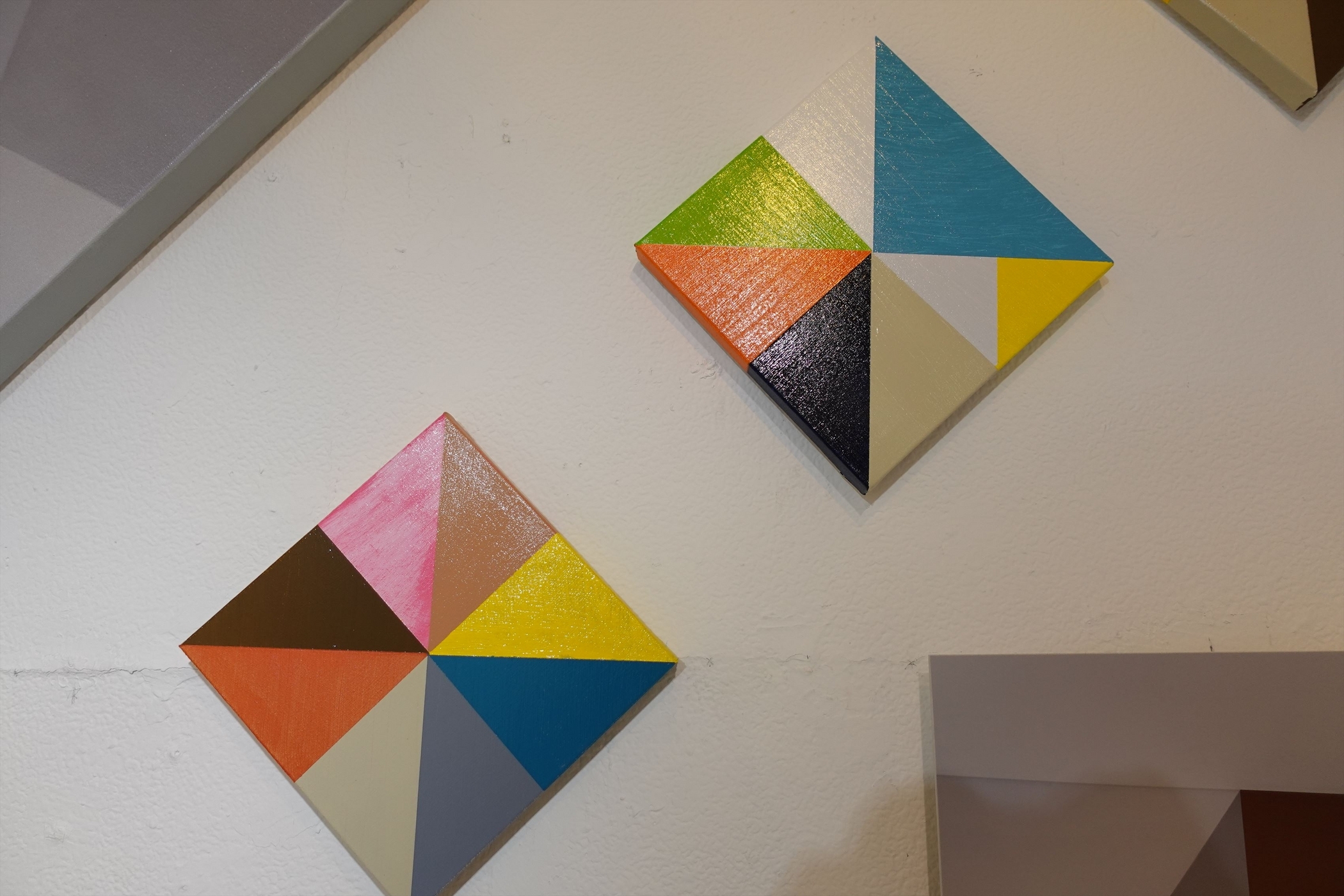 だが今回の展示では一変してカラフルかつ小ぶりな作品が、正方形(ひし形)となって多数散りばめられており、色味の鮮やかさ、コントラストの強さといい、表面の塗りの質感といい、密集・配列具合といい、抽象「絵画」そのものであった。トークで知ったが、これらは撮影した写真データをカンバスに焼き付けており、上から色を塗ったり、カラフルな壁面や角を被写体としたもののようだ。