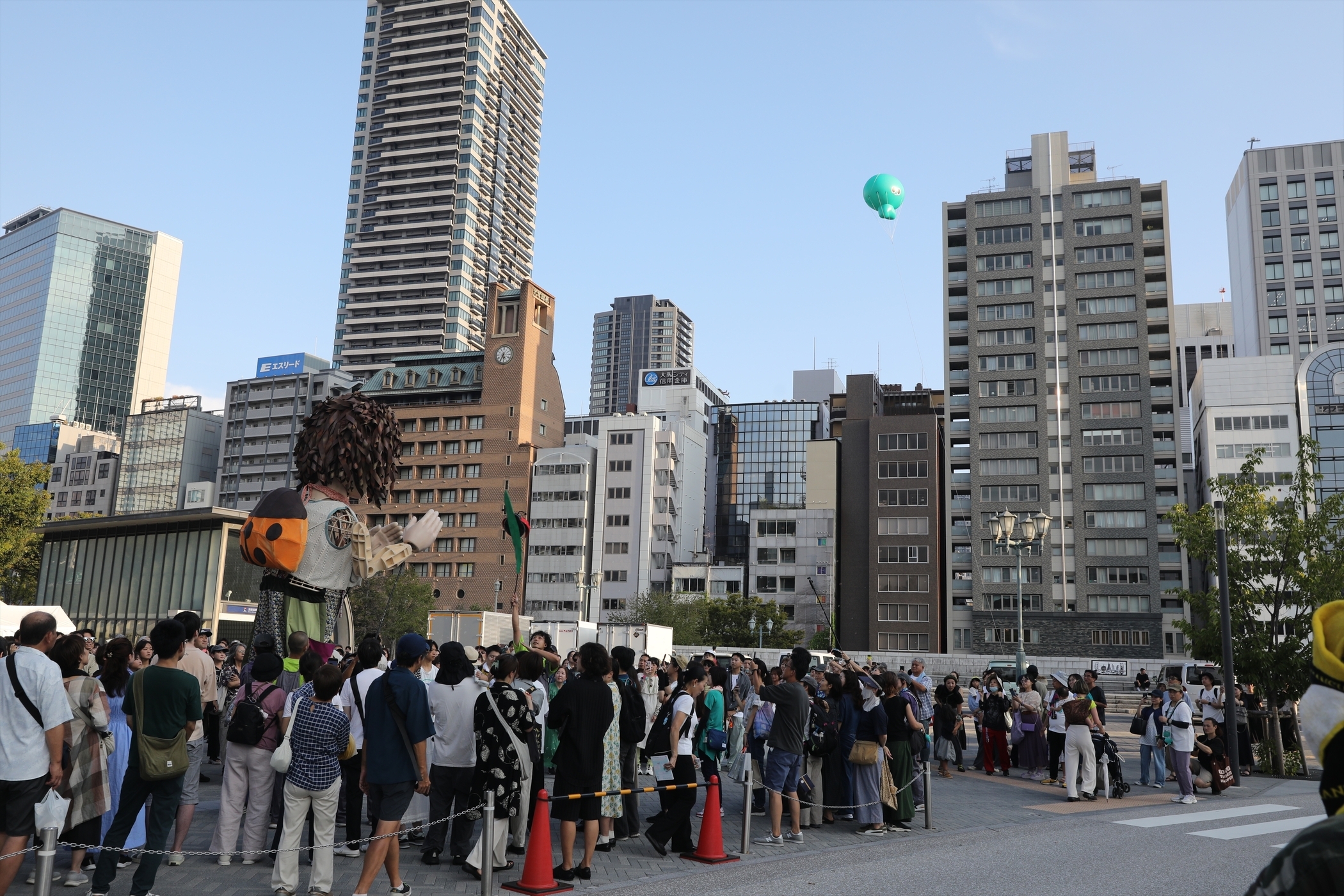 マルシェをだいたい見て回って、19時からのVRイベントが18時半開場なので、早めに並んでおこうと、中央公会堂の横断歩道へ向かうと、人間よりも遥かに巨大な人形が座っていた。
